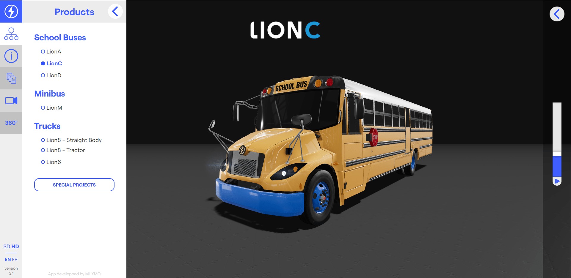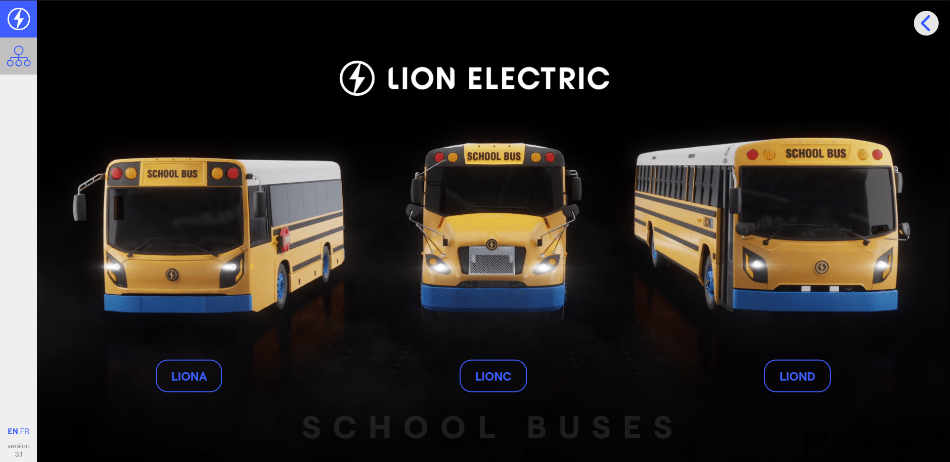Marketing tool to present the multiple vehicles of the manufacturer Lion Electric, as well as their different features and options. The application is accessible via the web or in a standalone mode that can be integrated to interactive terminals. This application is continually evolving along with the development of new vehicles by the growing company.